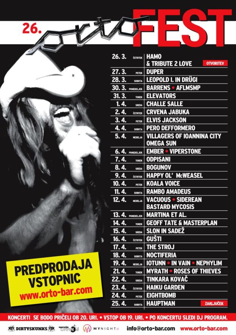 Festival se bo odprl v četrtek, 26. marca, z nastopom skupine Hamo & Tribute 2 Love, ki velja za eno najbolj prepoznavnih domačih koncertnih imen. Že naslednji večer bo sledil makedonski Duper, zasedba, ki uspešno briše meje med žanri, sobota pa prinaša Leopolda I. in Drügije.