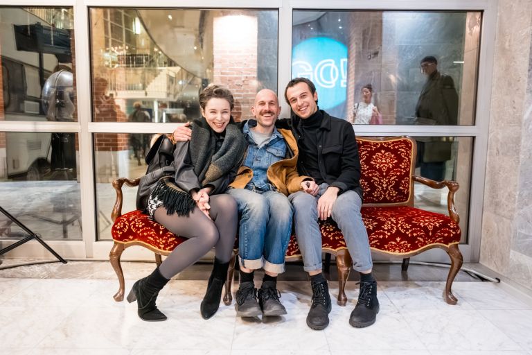 Igralca Nataša Keser in Klemen Kovačič sta se razveselila srečanja z avtorjem videov dodekologije Carlom Zorattijem.