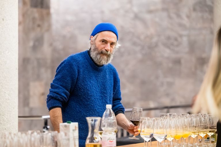 Tomi Janežič si je po predstavi privoščil kozarec rujnega.