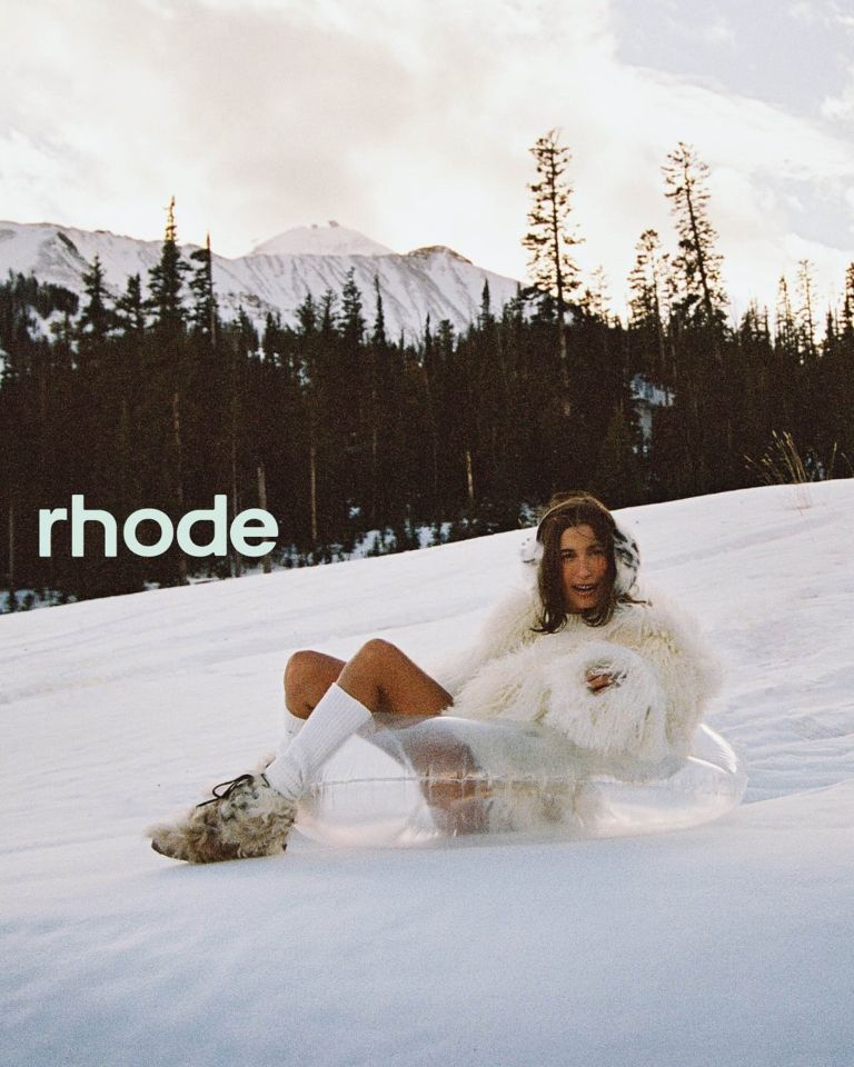 Hailey Bieber v kampanji za svojo znamko Rhode pozira sredi zasnežene gorske pokrajine in to v kratkem puloverju, visokih nogavicah in zimskih škornjih, z golimi nogami na ledu. Deluje absolutno zapeljivo in vroče …