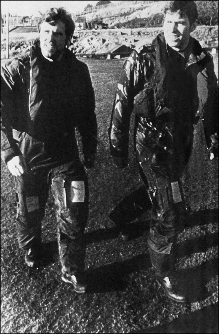 Podporočnik Andrew Windsor (desno) s članom posadke helikopterja Sea King v Port Stanleyju med falklandsko vojno, 20. junij, 1982.