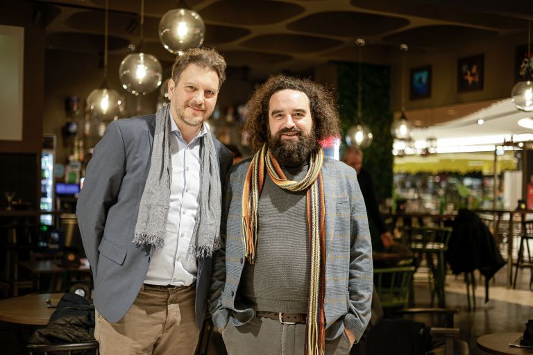 Koscenarist Marko Bratuš se je razveselil obiska generalnega direktorja Cankarjevega doma Jureta Novaka.